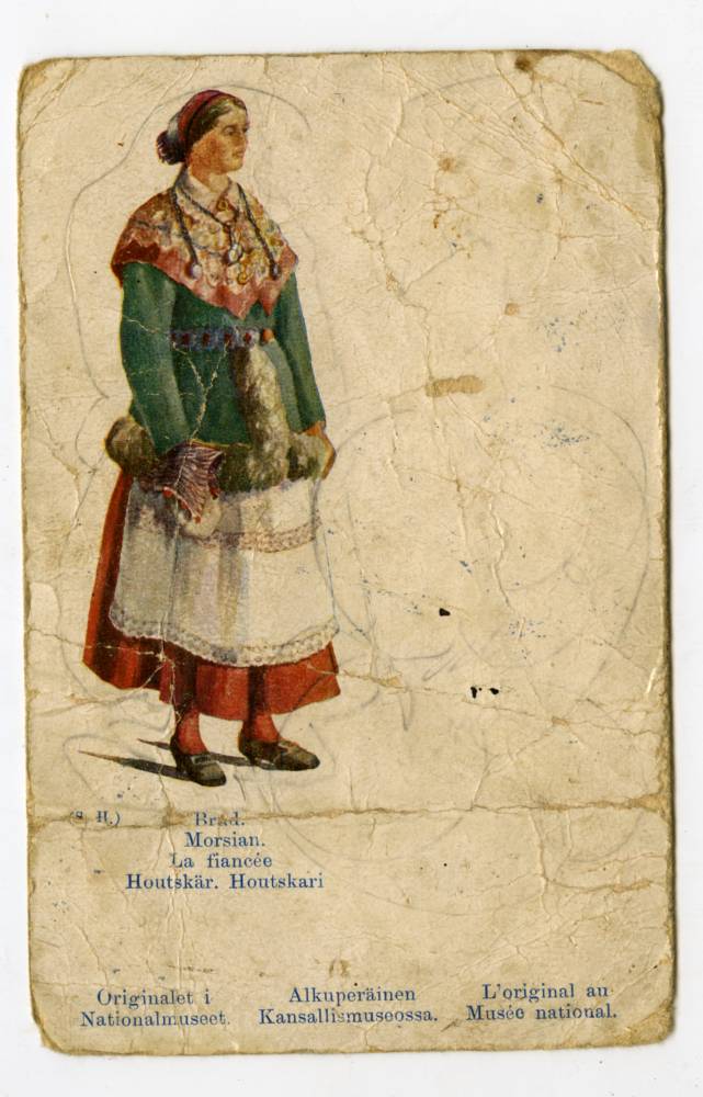 Gammalt postkort med bild av Houtskärs bruddräkt. Orginalet i Nationalmuseet.