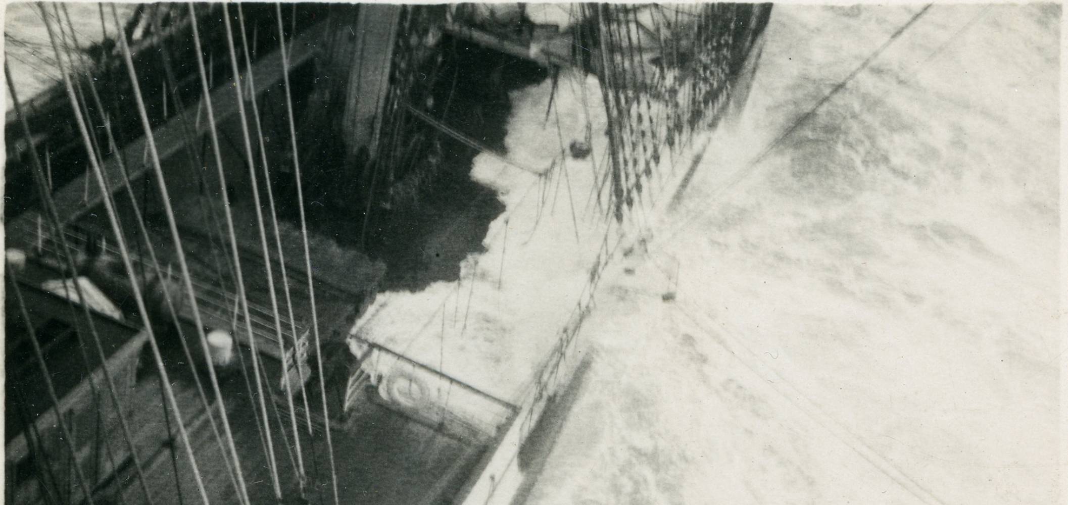 The sea reaches over the deck.
