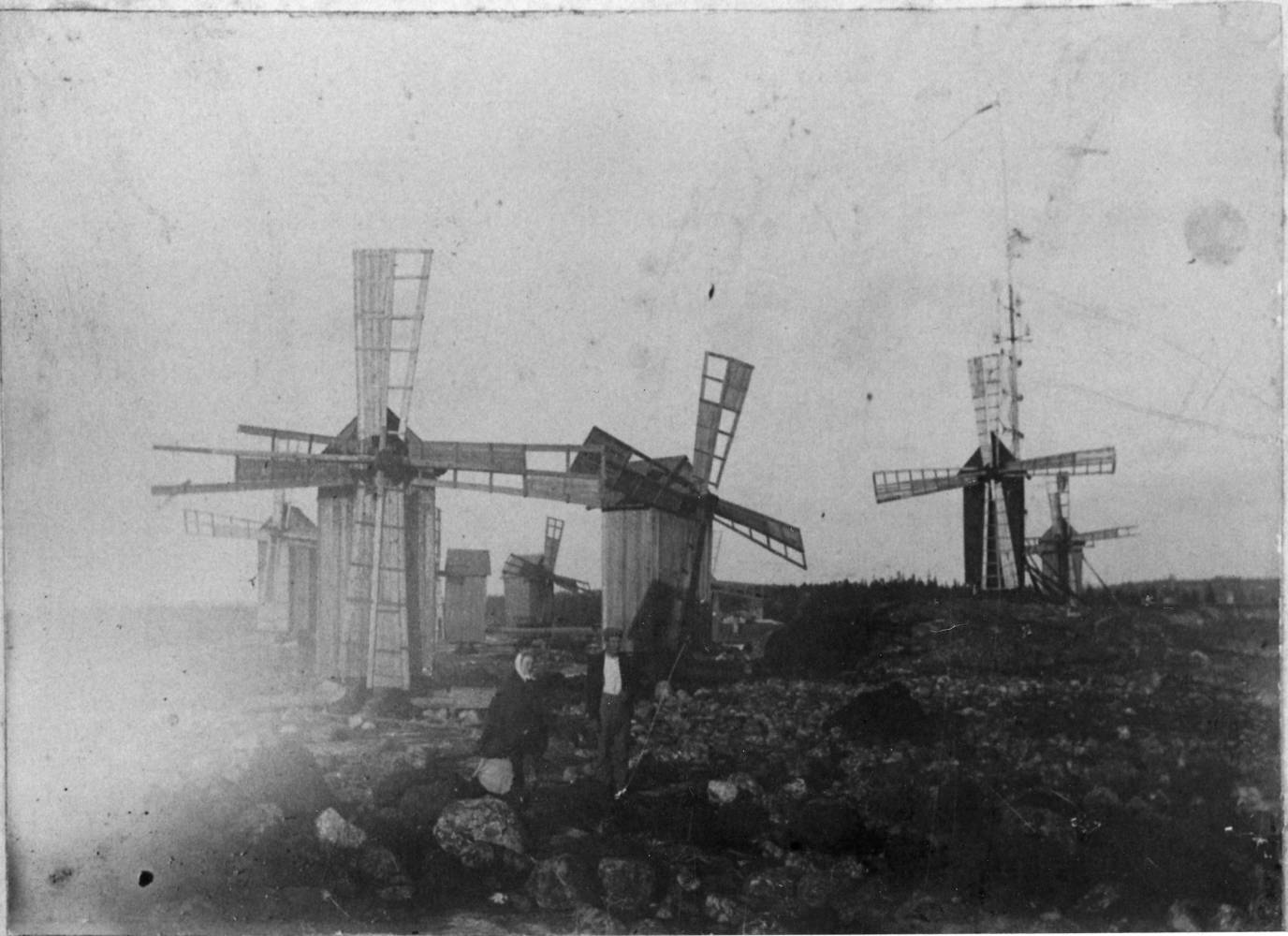 Väderkvarnar i Björkö Fr.v. Pist . NN, Storstu. Joss. Back. Midsommarstången. Mickels På Västra SVINVALLAN