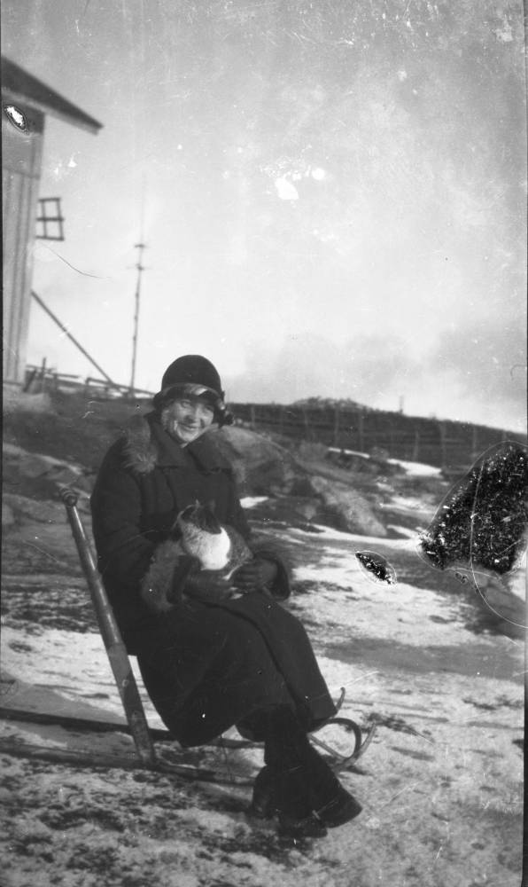 Östra Saverkeit, unknown person with a cat in their arms, midsummer pole visible behind