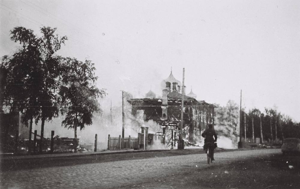 A soldier cycling alone on a road in East Karelia. Next to the road the houses are burning. The picture is part of Runar Åminne's war picture series.