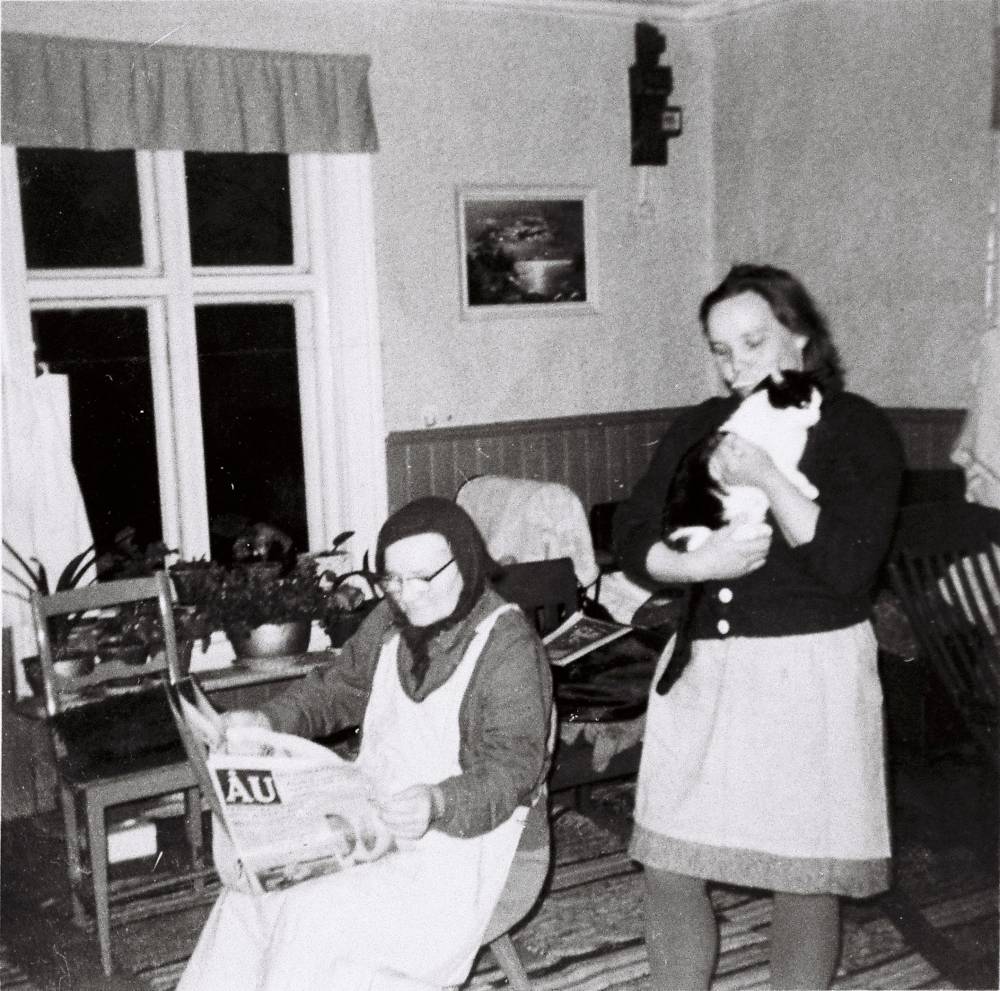 Hildur Nyroos lukee ÅU:ta, Else pitää kissaa.
